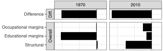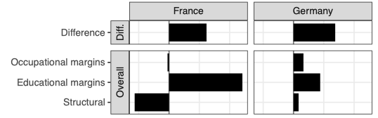 Comparing the countries to each other is even more interesting! In Figure 3, we find that Germany’s higher linkage in 1970 is almost entirely explained by Germany’s different educational distribution. In other words, France’s educational system was providing as good a match as the German system did, but it provided such a good match for a much smaller part of the workforce. In 2010, a lot of the difference is structural, consistent with the over-time comparison. The results in the paper are much more detailed, breaking down the components further by education and occupation.
