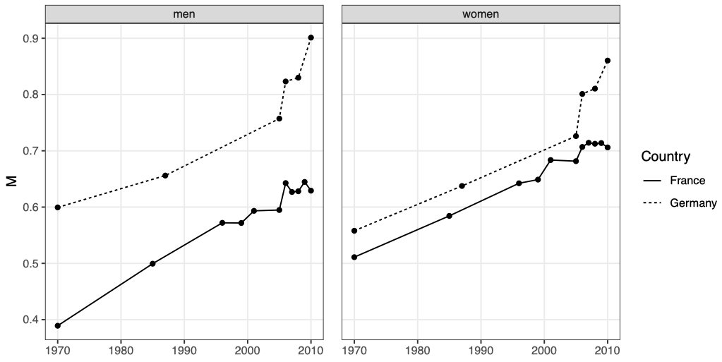 Our first major finding is that there are strong gender differences: France and Germany look very different when we focus on men, but much less different when we focus on women. Historically, many studies have focused on men only, which gives a one-sided picture. Figure 1 shows the time-series for our measure of linkage.